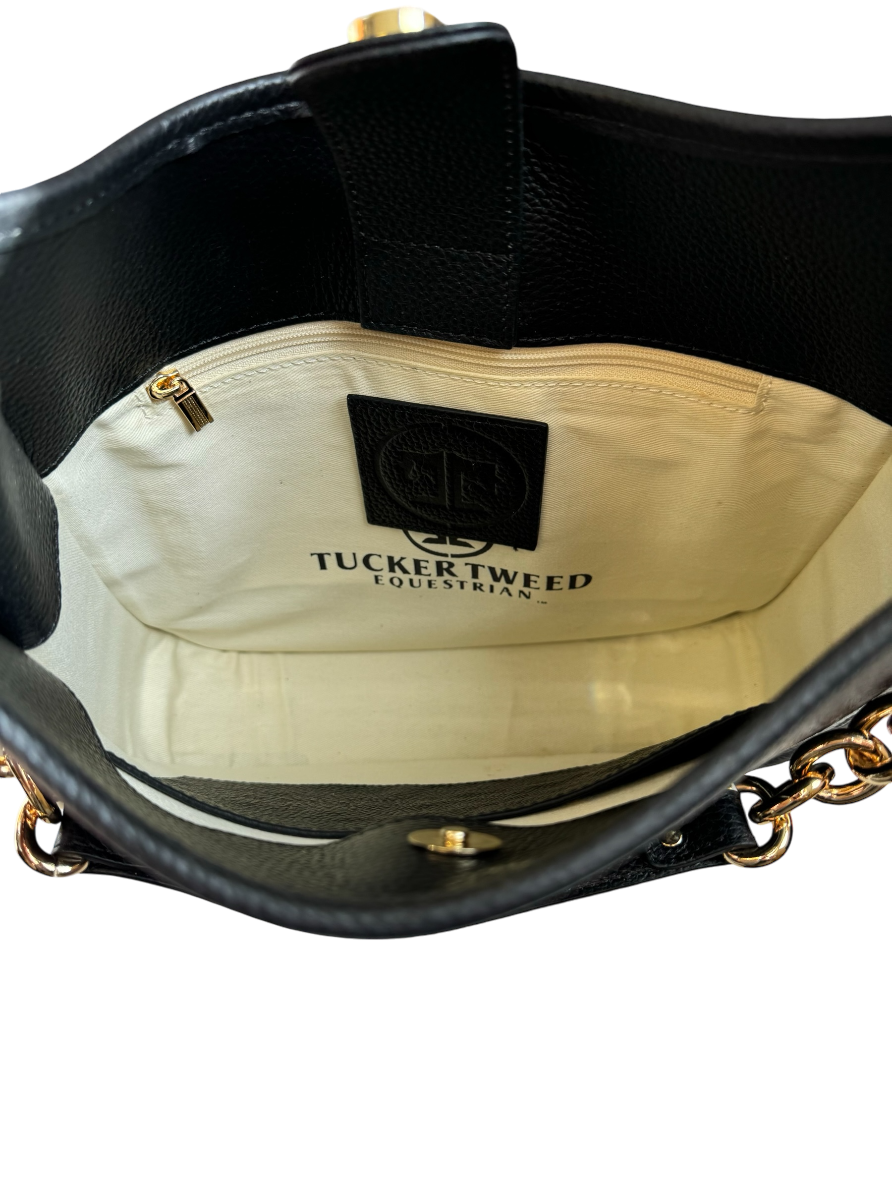 Our newest handbag in the Tucker Tweed stable, this luxurious and sleek style pays homage to Middleburg, VA, “the Nation’s Horse and Hunt Capital”. Available in both black and camel, this handbag featured a beautifully lined vanilla interior, outer and interior pockets, magnet close, optional chunky chain and optional adjustable shoulder strap.