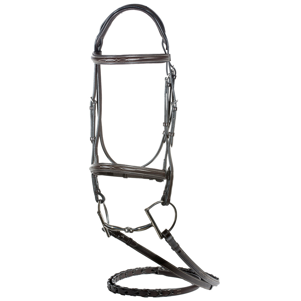 Premium bridle leather with stainless steel hardware and padded inlaid crown. Features raised design with fancy stitching on browband and cavesson. Includes matching laced reins. Built for both everyday riding and competition.