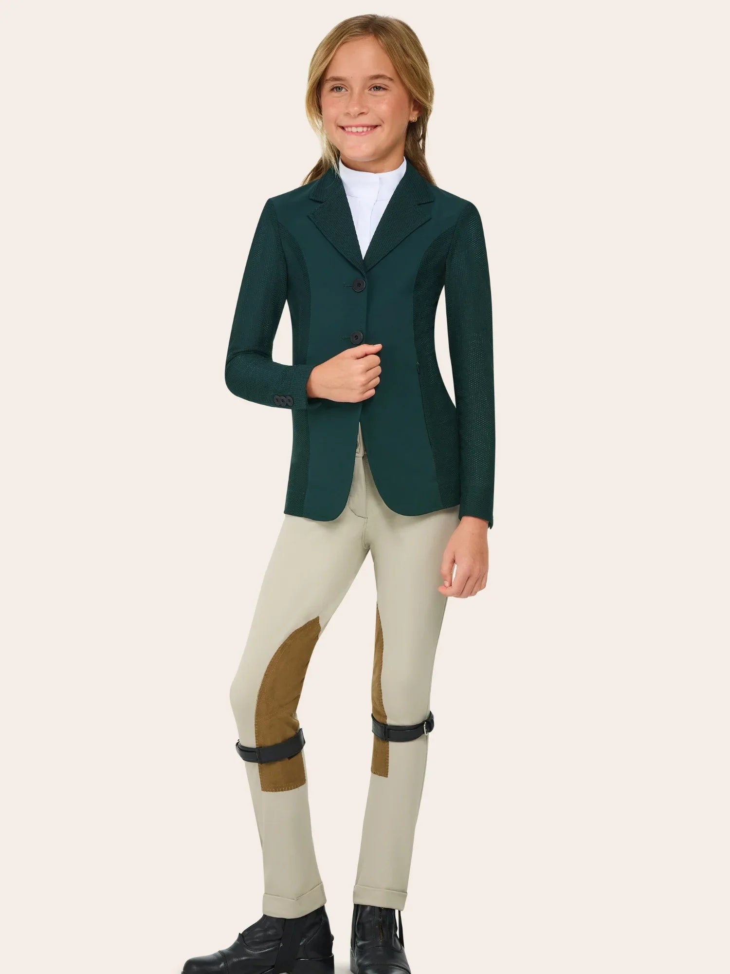 RJ Classics' best-selling girls' show coat features a streamlined silhouette with lightweight mesh construction for superior breathability. The Italian Jersey front panel delivers refined contrast, while unique back seams and vertical snap-closure pockets add polished detail. Matte logo buttons and traditional RJ sizing ensure a consistent, competitive fit.