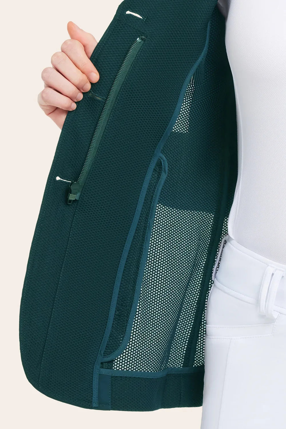 The Harmony 3-button mesh show coat combines lightweight breathability with polished equestrian style. Italian Jersey front panel and unique back seams deliver refined aesthetics, while vertical zipper pockets and matte logo buttons add functional detail. R.J. Classics' signature fit ensures consistent sizing and comfort in the saddle.