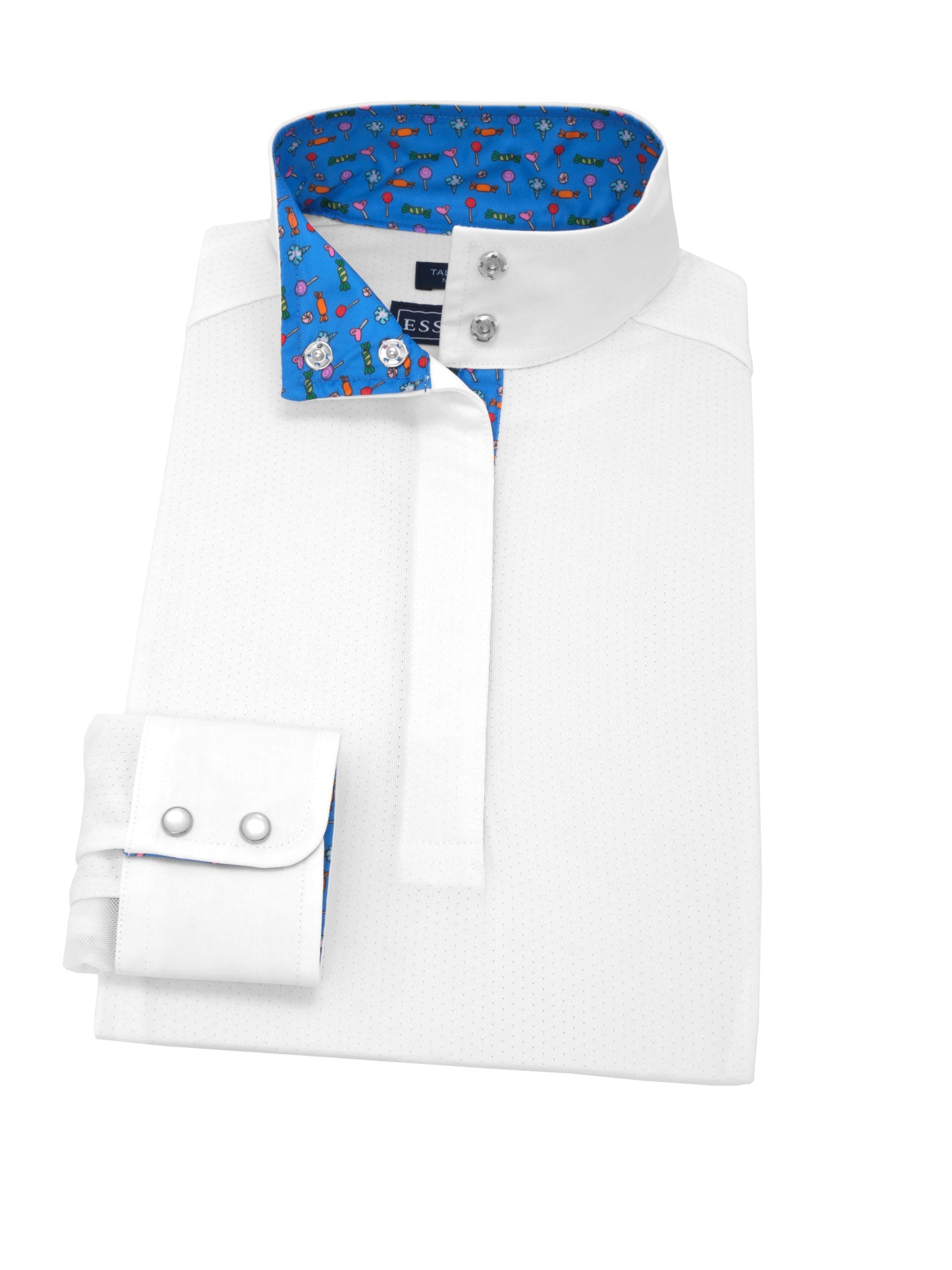 Our Talent Yarn® Show Shirt is the classic choice for looking crisp and polished in the show ring. Expertly tailored in easy pullover style with a gently tapered body fit for a neat appearance with or without your show coat. Unsnap the collar and turn back the cuffs to show our exclusive fabric trim. Smart, thermoregulating technology helps maintain an optimal body temperature. Moisture wicking and deodorizing antimicrobial properties provide quick dry and stay fresh benefits that never wash out. Stain resistance helps keep your shirt looking new wash after wash. Breathable, stretch Talent Yarn keeps you comfortable in the saddle even on the longest days.